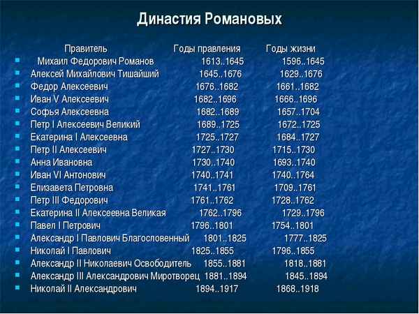 Династия романовых (хронологическая таблица)